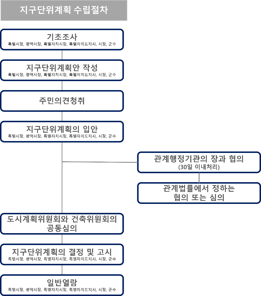 업ㆍ유통ㆍ관광휴양ㆍ복합 등 지구단위계획구역의 중심 기능, 용도지역의 특성 등을 고려하여 수립하며 절차는 아래와 같다.
