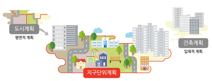 지구단위계획은 「(구) 도시계획법」에 의한 상세계획과 「건축법」에 의한 도시설계를 하나로 통합한 제도로서 평면적인 토지이용계획과 입체적인 건축계획의 중간적 성격을 지닌다.